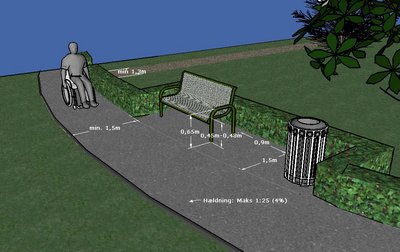 - Bænke bør udformes, så de er gode at sidde på, og de bør give støtte, når man skal sætte/rejse sig. Materialet bør være glat og let at rengøre. Bænke bør have sæde, som er ca. 0,45-48 m højt og 0,45 m dybt. Siddevinklen mellem det vandrette sæde og ryglænet bør være ca. 100°. Fritstående bænke bør være forsynet med ryglæn og armlæn. Armlæn bør være 0,20 m højere end sædet og udformet, så det er godt at gribe om og støtte sig til.